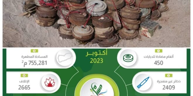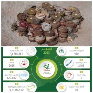 كما تمكن المشروع خلال أكتوبر 2023 من نزع 2409 ذخيرة غير منفجرة، و450 لغماً مضاداً للدبابات، بينما بلغ إجمالي المساحة المطهرة خلال نفس الشهر 755.281 متراً مربعاً من الأراضي اليمنية.