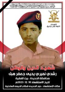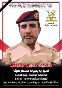 نعت قيادة اللواء الأول زرانيق في القوات المشتركة, ممثلة بالعميد/ سليمان يحيى منصر عضو القيادة العامة للقوات المشتركة ، اليوم، استشهاد إثنين من منتسبيها الابطال / ” نميري يحيى جعفر هبل، وولده البطل/ رشدي نميري يحيى جعفر هبل، والذي ارتقوا شهدا، مقبلا غير مدبر ، يوم الأحد 10 /12/ 2023م اثر إصابتهم في متارس الشرف بجبهة الساحل الغربي قطاع الحيمه وهم يؤدون واجبهم الديني والوطني في ميدان العزة والكرامة