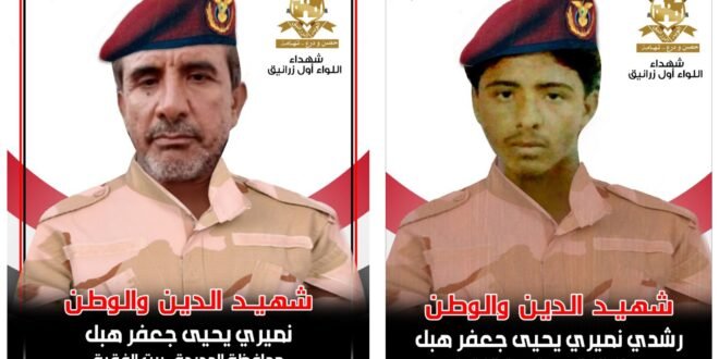 نعت قيادة اللواء الأول زرانيق في القوات المشتركة, ممثلة بالعميد/ سليمان يحيى منصر عضو القيادة العامة للقوات المشتركة ، اليوم، استشهاد إثنين من منتسبيها الابطال / ” نميري يحيى جعفر هبل، وولده البطل/ رشدي نميري يحيى جعفر هبل، والذي ارتقوا شهدا، مقبلا غير مدبر ، يوم الأحد 10 /12/ 2023م اثر إصابتهم في متارس الشرف بجبهة الساحل الغربي قطاع الحيمه وهم يؤدون واجبهم الديني والوطني في ميدان العزة والكرامة