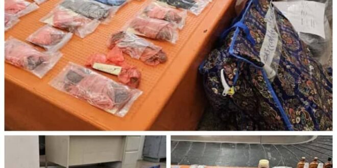 حيث أورد تقرير دوري صادر عن إدارة أمن المطار تلقت وكالة الانباء اليمنية “سبأ”، نسخة منه بأن الأجهزة الأمنية والعسكرية تمكنت من إيقاف 13 حالة، لأشخاص ممنوعين من السفر ومتورطين في قضايا جنائية مختلفة، إلى جانب إحباط محاولة تهريب أكثر من 21 كيلوجراماً من مادة القات ، وضبط 9 علب من مادة “التنباك” المحظورة المخلوط بمواد مخدره، إضافة إلى 18 طلقة نارية ومسدس تم العثور عليهما أثناء عمليات التفتيش الأمني.
